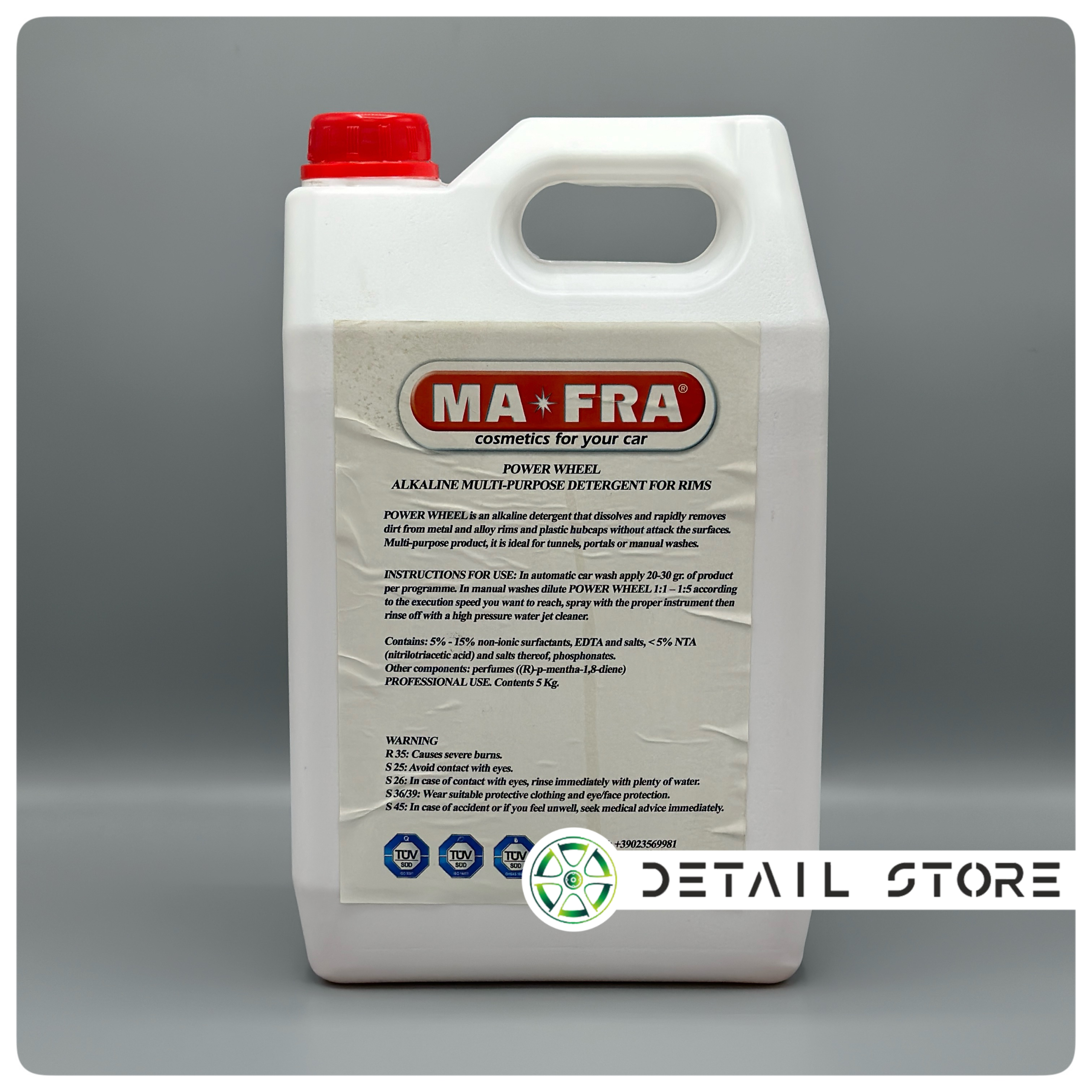 مایع رینگ شور مفرا 5 کیلوگرمی Mafra Power Wheel محصولی حرفهای برای تمیز کردن و درخشندگی رینگهای خودرو است. این شوینده با فرمولاسیون قلیایی و PH خنثی، بهطور مؤثری آلودگیها، لکههای روغن و ضایعات ترمز را از بین میبرد. همچنین، این محصول به سطوح فلزی و پلاستیکی آسیب نمیرساند و ظاهری نو و براق به رینگها میبخشد.