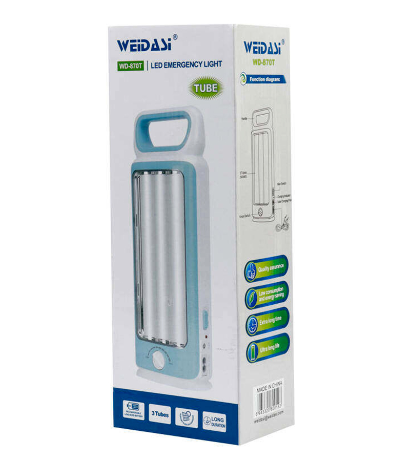 چراغ اضطراری ویداسی مجهز به کلید فیزیکی تنظیم میزان روشنایی و دارای کلید روشن و خاموش و دارای ۲ حالت نوردهی مختلف (۲ لامپه / ۳ لامپ باهم) دارای ۳ عدد لامپ LED با نور مهتابی، تأمین انرژی از طریق برق شهری و دارای درگاه ورودی شارژر پنل خورشیدی دارای دسته برای حمل آسان چراغ قوه و قابلیت نصب روی دیوار باتری از نوع Lead-Acid با ظرفیت ۳۵۰۰ میلی آمپر ساعت می باشد.